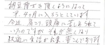 肩こりがなくなったとのこと。血行が良く なったことの証ですね。これからも末永く ご愛飲ください。 |