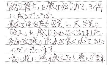 血圧が安定した上に、手足の冷え性まで なくなって、よかったですね!これからも 納豆博士をヨロシクお願いします。 |