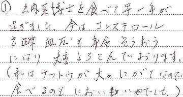 血液サラサラは、「納豆博士」と食生活、 運動の継続が大切です。今後ともお続け くださいね! |