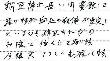 ご夫婦おふたりの血圧が安定されている とのこと。嬉しいお便りをありがとうござ います。これからも宜しくお願いします! |